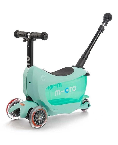 Once they are ready to stand, remove the seat and the Mini2Go Deluxe converts to a stand-on scooter with adjustable handlebar.