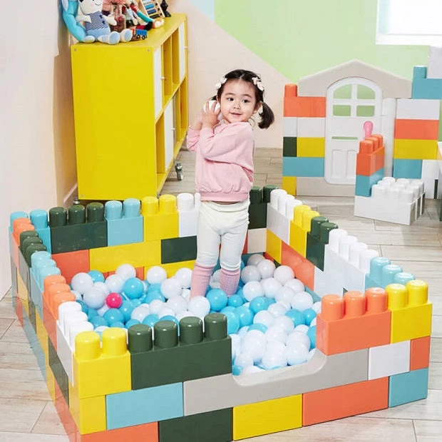Haenim Toy My first house set comes with a door, roof and table top. People can own their first property with care. The edges of the oversized and interlocking blocks are not sharp and rounded to ensure safer game time.