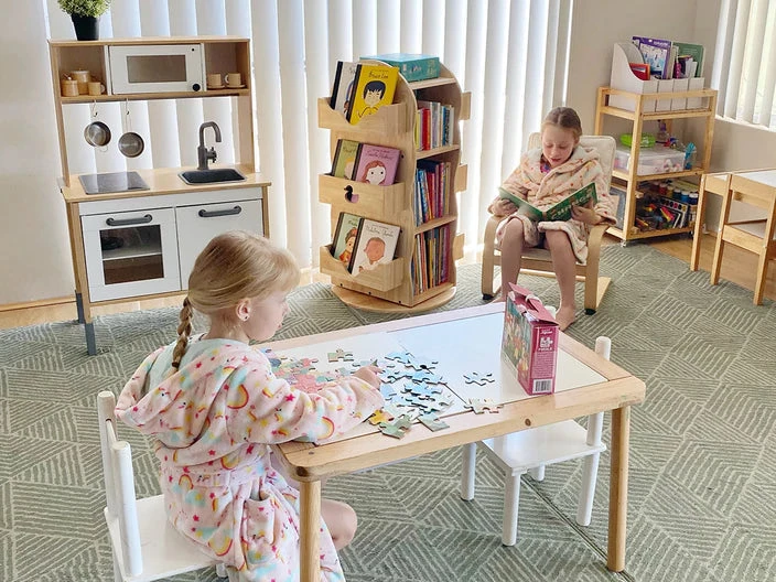 My Duckling Revolving Solid Wood Bookcase provides more storage space and display for books with the concept of space-saving. This bookcase can store up to 300 books, which makes it suitable for schools and kindergartens while still perfectly suited for the kids bedroom or playroom.