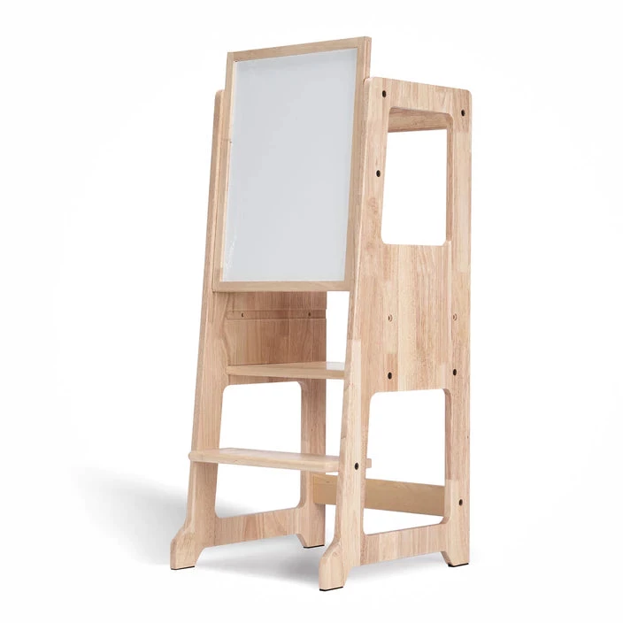 Our Children’s Solid Wood Adjustable Learning Tower 2in1 is uniquely designed with two built-in platform heights. So that it can support your child in all their stages of growth.  It is equipped with an exclusive removable magnetic drawing board, placed on the back. Allowing your kids to comfortably draw, do puzzles or use it with the magnetic tiles.