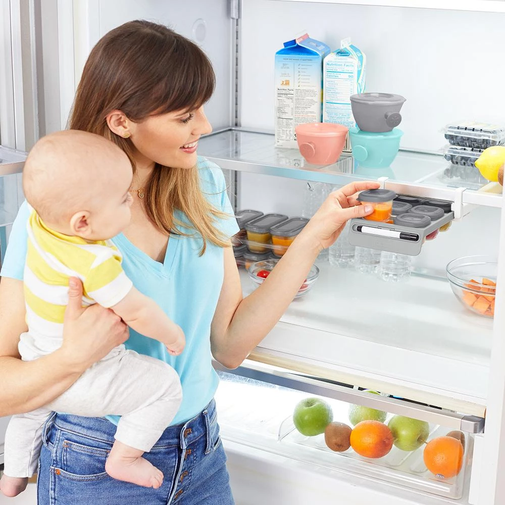 A space-saving solution for storing fresh baby food in your fridge or freezer, our sliding tray set keeps you organized and ready to go at feeding time. Easy to clip underneath your fridge or freezer shelf, the sliding design includes a dry-erase marker for labeling plus eight containers with lids for on-the-go convenience. Time-saving tools for smart prep and feeding-at home & on the go!