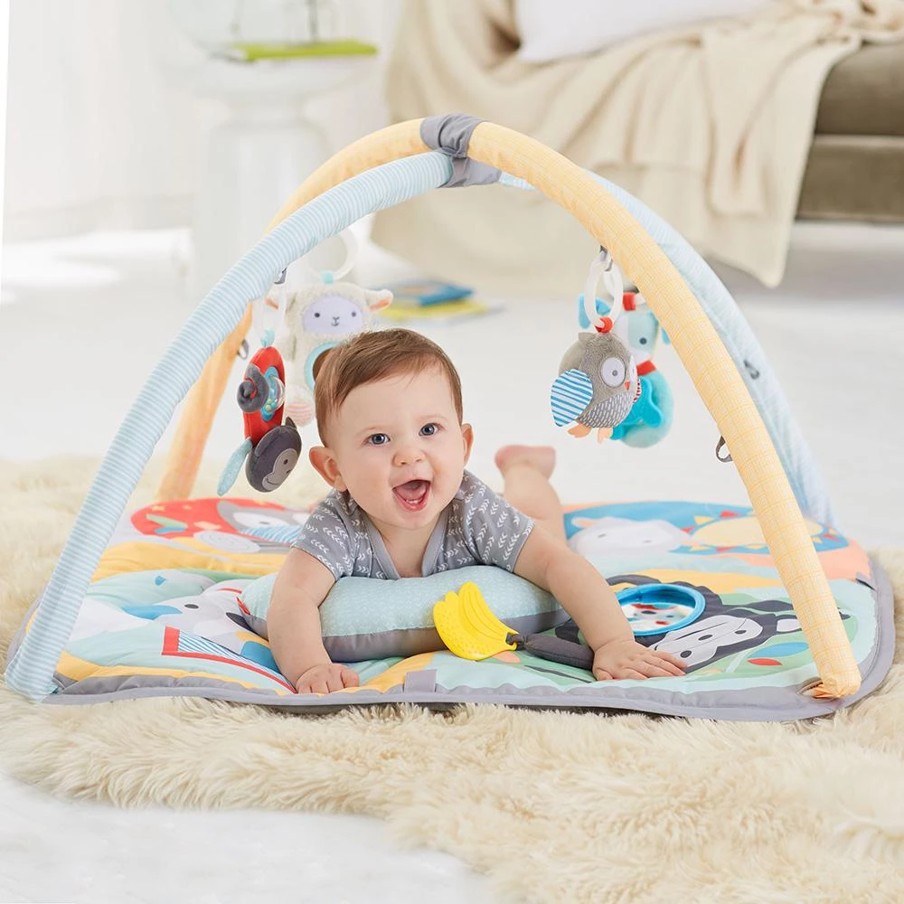 Bright, colorful prints and adorable animals engage baby in multisensory play. Four hanging toys include a baby-safe mirror, music, rattle, teether and more. Tummy time is extra fun with multiple textures and activities on the mat including crinkle, a removable mirror and teether. Little ones will be entertained with lots to hear, see, feel and touch!