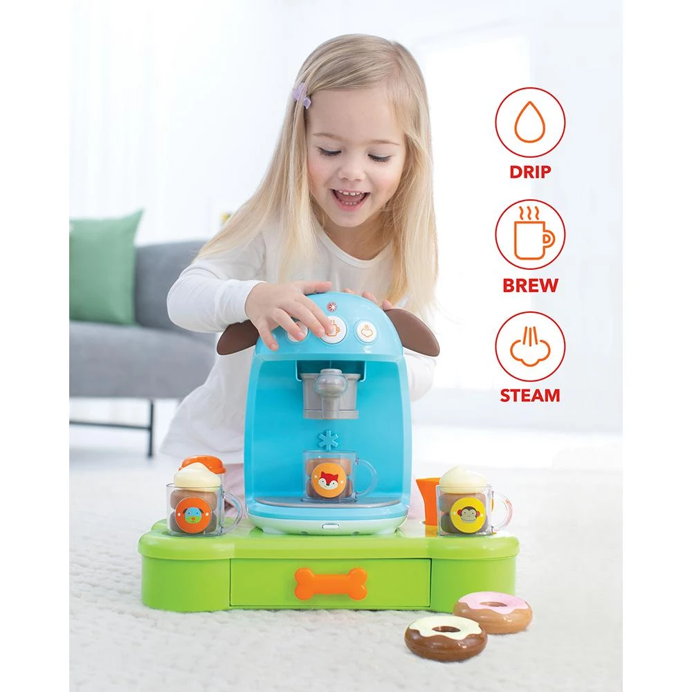Build-your-own cafe treats! Loaded with a whole latte fun, little ones will love to make and serve yummy drinks like a real barista with this doggone cute set. A fill & drop filter, real coffee shop sounds, plus all the extras make this 19-piece set a perfect pick for pretend play.